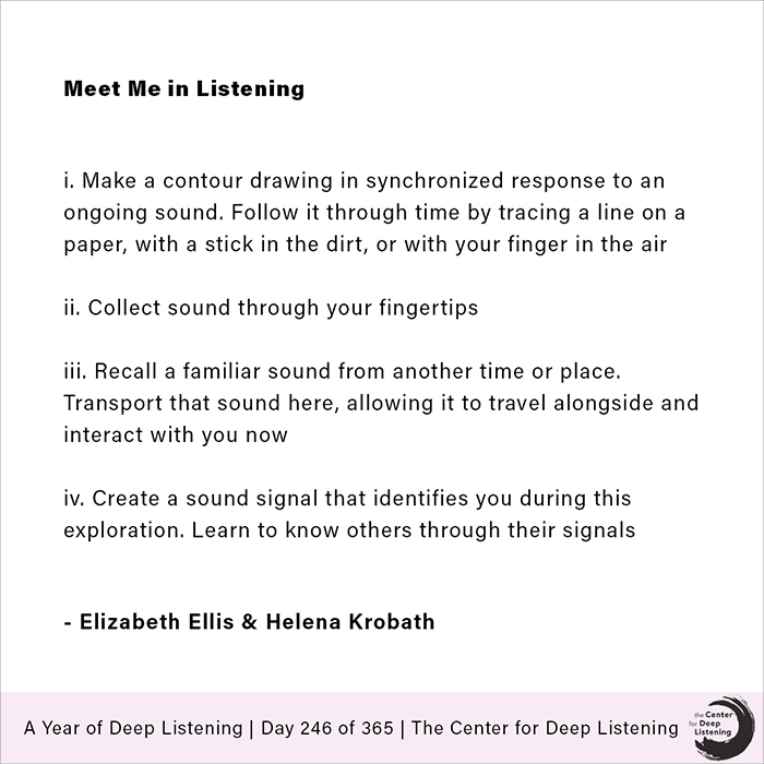Meet Me in Listening is an excerpt from a project of the same name, created by Elizabeth Ellis and Helena Krobath. The artists experimented with ways of sharing listening, recursively soundwalking and debriefing on a chosen route together over a period of time. The resulting text invites listeners to imagine their connectedness by way of sound. Each movement is open-ended and benefits from experimenting and repetition. The text was also the basis of an interactive public soundwalk in 2018 (presented by Vancouver New Music and Vancouver Soundwalk Collective).